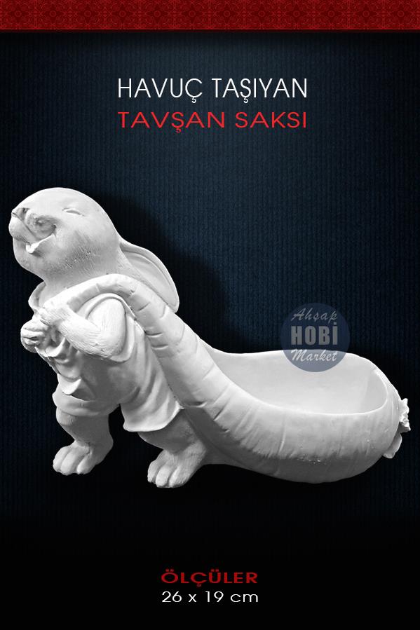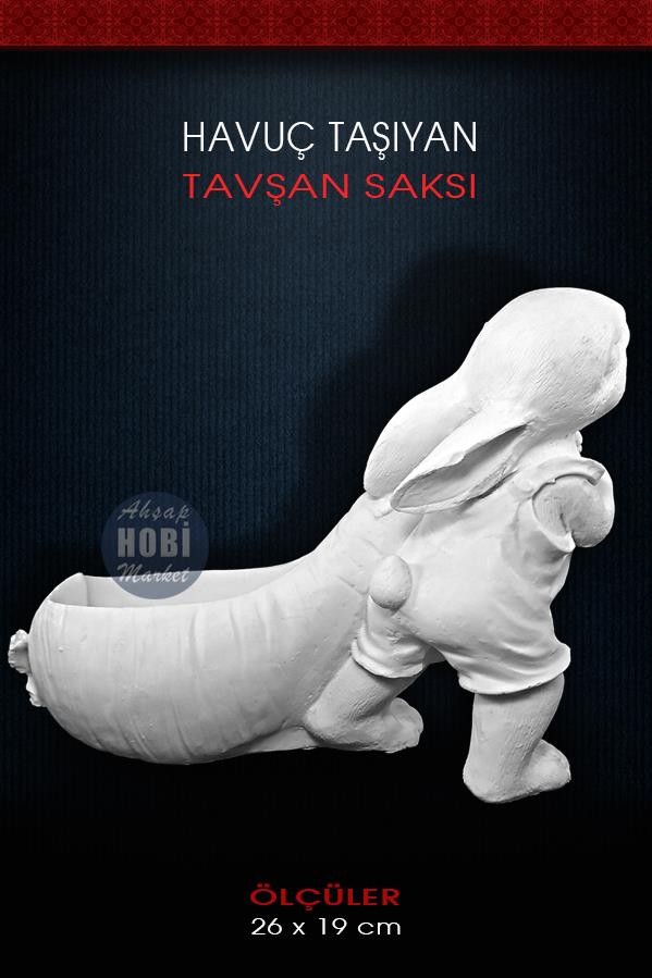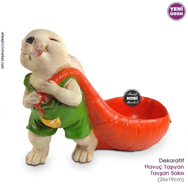 Polyester Havuç Taşıyan Tavşan Saksı, 19 cm yüksekliğinde, 26 cm genişliğinde, 13 cm derinliğinde üç boyutlu bir aksesuar saksı objedir. Saksı Ölçüsü 11x7,5 cm boyutunda, saksı derinliği ise 5 cm ölçüsündedir.